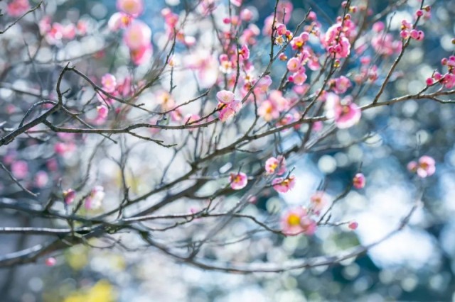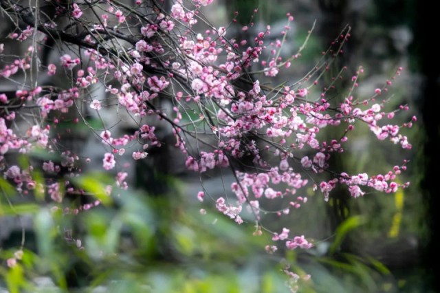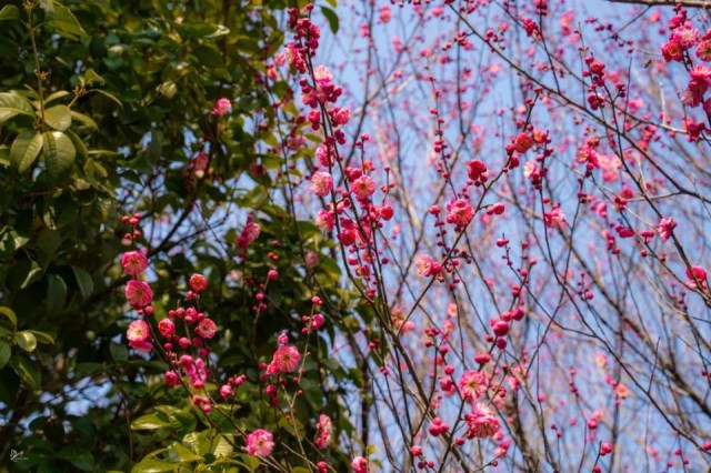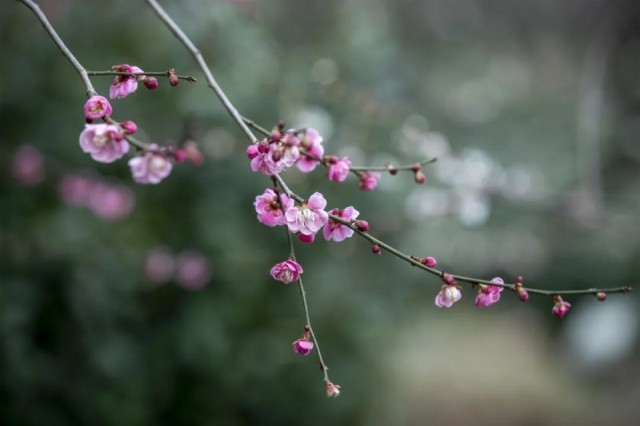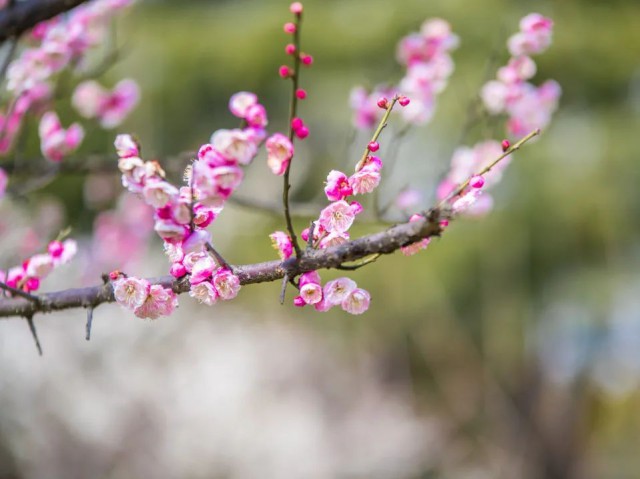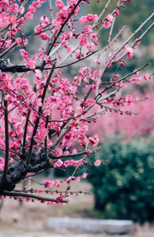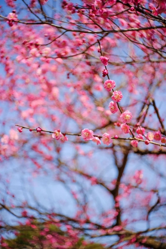 这里的梅花高低错落,肆意地展现自己的曼妙姿态,远远望去,整个梅花园都是“粉粉嫩嫩”的,呈现一派生机勃勃的景象。