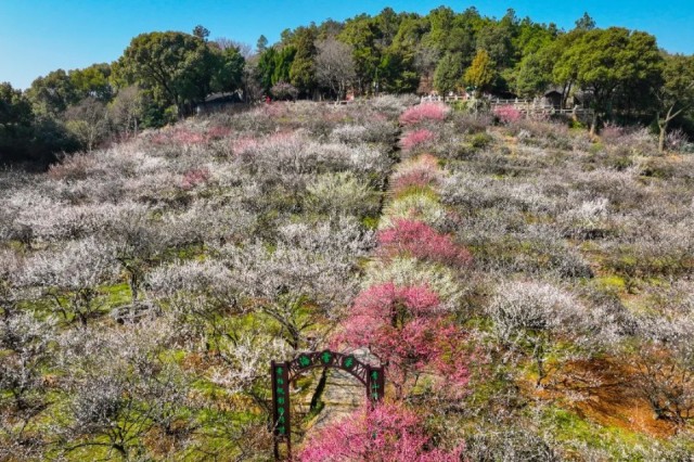微风拂过,花影婆娑,暗香浮动,如诗如画,更添江南神韵。寻梅访古之际,拾级而上,还可直达莫厘峰顶。