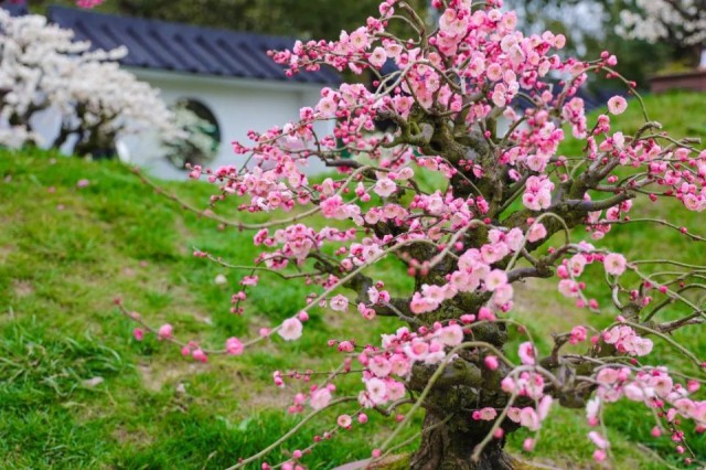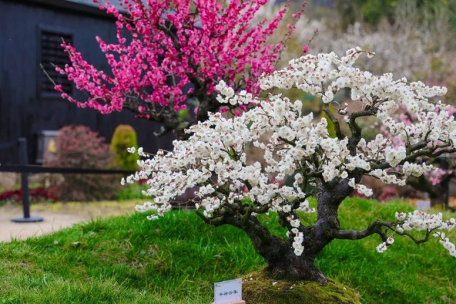 园内的梅花盆景同样值得一赏,一棵棵盆景梅将梅花的“风”“雅”“韵”展现得淋漓尽致,吸引了不少游客驻足观赏,拍照留念。在同一棵树上,可以看到花开的各种形态,别有一份韵味。
