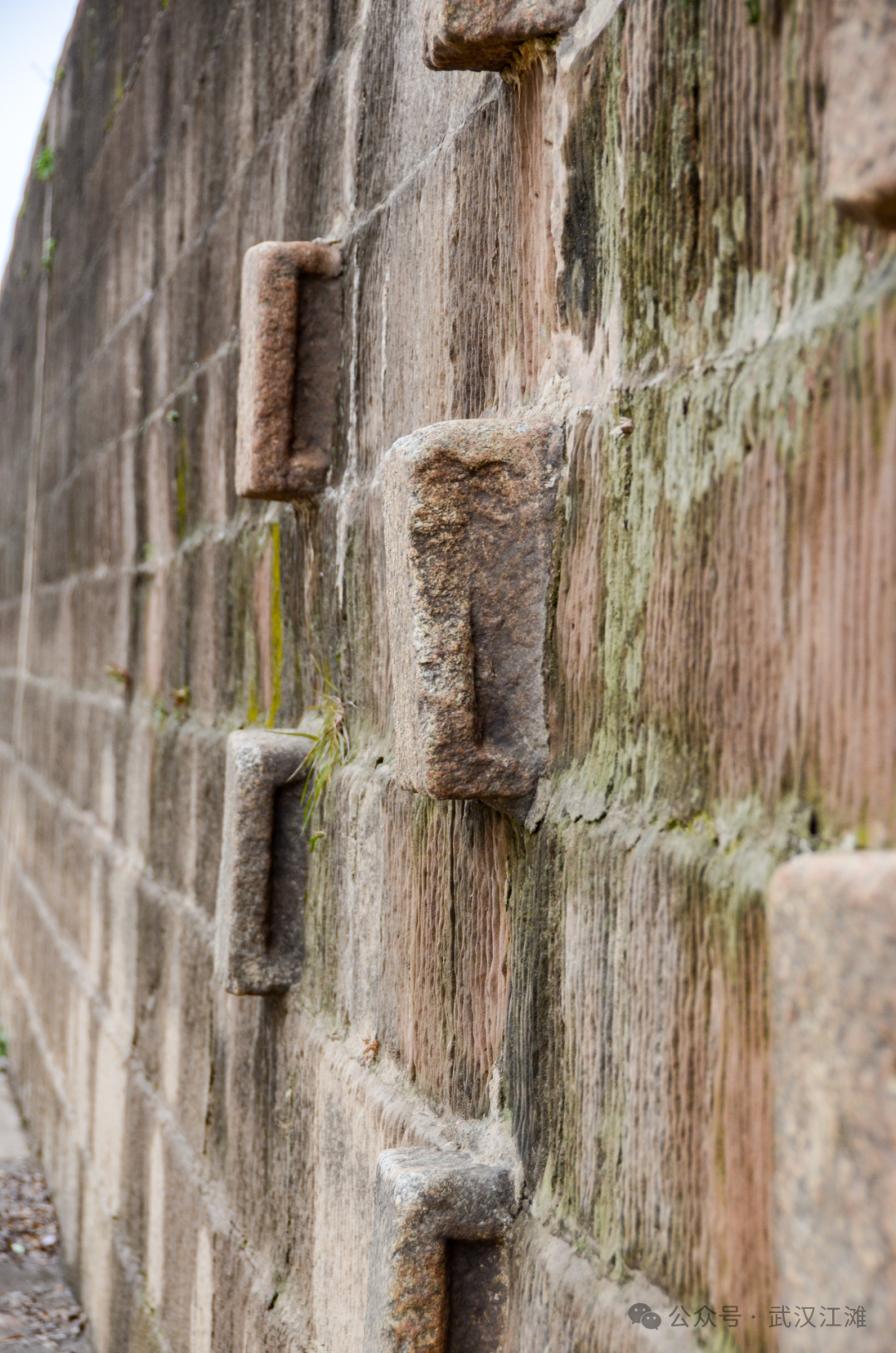 近看驳岸石壁,每块岩石都布满风化水蚀的痕迹,表面上还附着着一层暗绿色的苔藓,历史感扑面而来。
