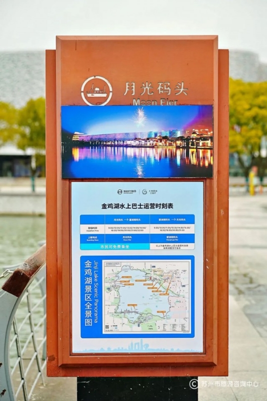 金鸡湖水上公共巴士由新时代集团管理运营。月光码头至望湖阁码头往返运营航线将先行开通。水上巴士每天首班9点,末班22点,全天运营21班次(具体详见班次表)。市民游客可免费乘坐。