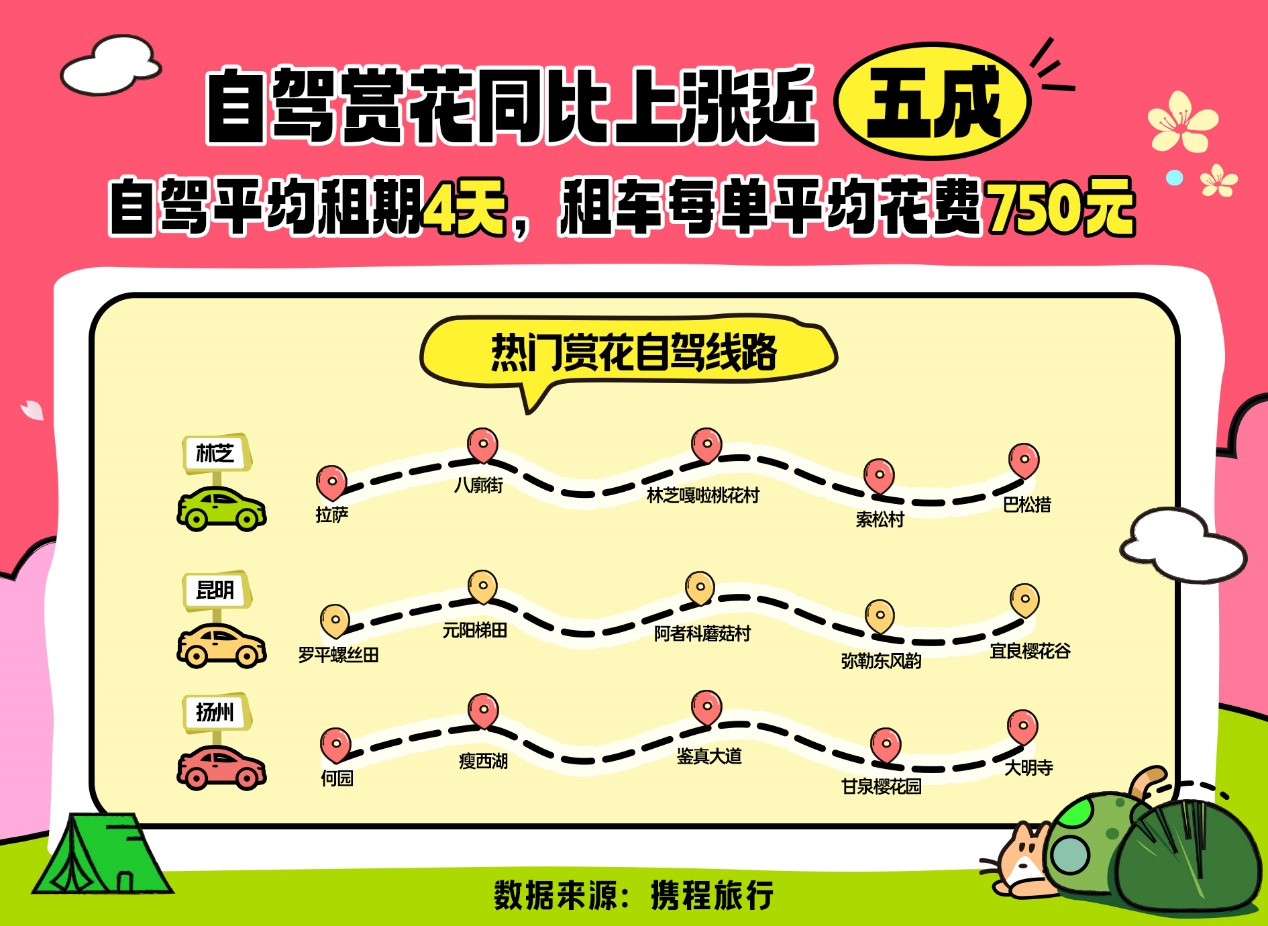 “自驾驶入春天”也是赏花踏青的主流方式,自由驰骋在春意盎然的景色中,跟随美景走走停停的赏花方式深受年轻人的追捧。携程租车数据显示,今年3至4月的租车订单量同比增长近五成。自驾用户赏花的平均租期为4天,订单均价约为750元。自驾游客年龄集中在90后和80后,分别占比35%和31%,00后的比例也达到了10%。从当前预订情况来看,今年春季自驾热门赏花目的地有:武汉、拉萨、无锡、扬州、昆明、洛阳、黄山、南京、伊犁和喀什。热门自驾路线有“拉萨—八廓街—林芝嘎拉桃花村—索松村—巴松错”“罗平螺丝田—元阳梯田—阿者科蘑菇村—弥勒东风韵一宜良樱花谷”“何园-瘦西湖-鉴真大道—甘泉樱花园-大明寺”等。