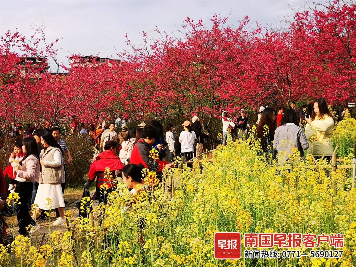 ▲桂林市南溪山公园里红艳的樱花与金黄的油菜花交相辉映。记者 唐晓燕 摄