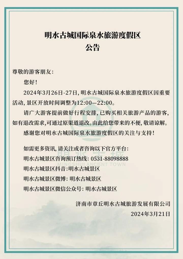 记者从明水古城官方公众号了解到,2024年3月26日-27日,明水古城国际泉水旅游度假区因重要活动,景区开放时间调整为12:00-22:00。