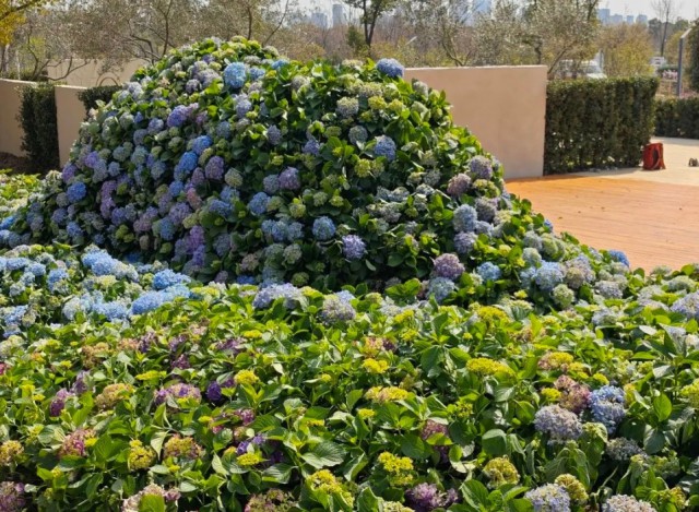 百花馆前,绣球花组成的立体花墙,仿若一道绚丽的瀑布。