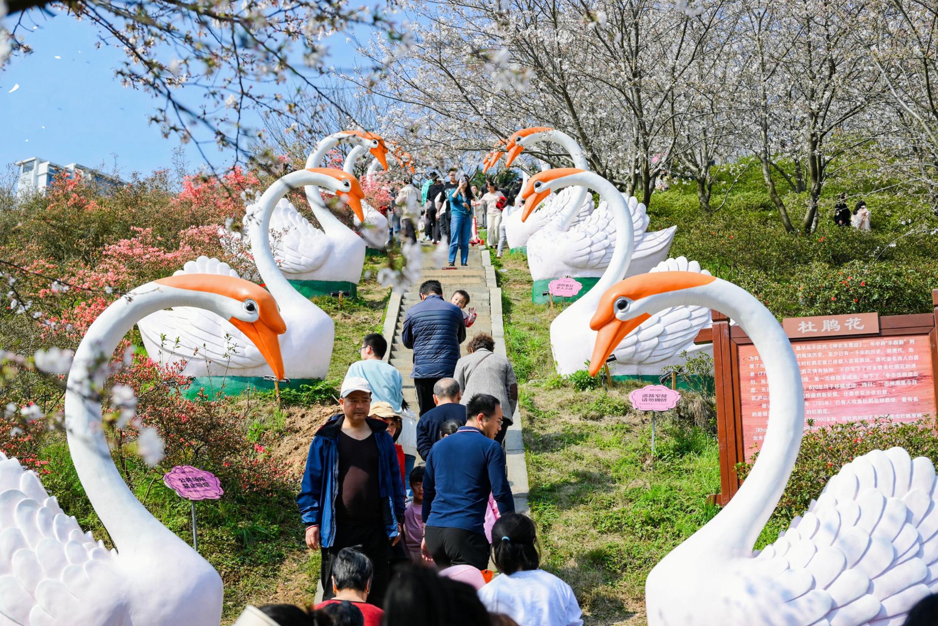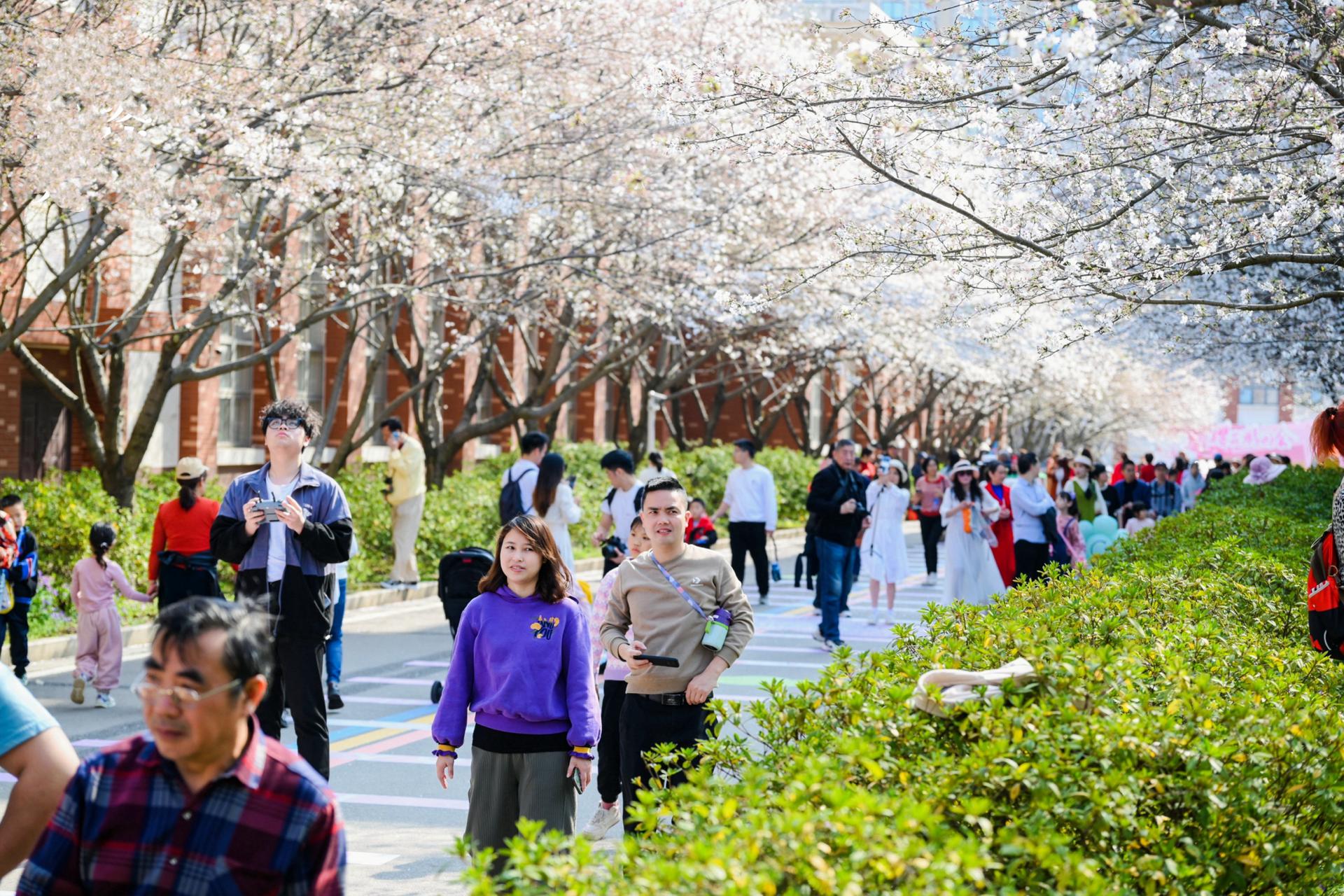 前来赏花的游客挤满了园区各个角落,尤其在樱花大道,赏花游客接踵摩肩,或驻足观赏,或用手机、相机拍摄樱花。在樱花集市、古风变装现场,不少游客前去参观购物、品尝各类小吃美食,每个人的脸上都洋溢着幸福喜悦的笑容。