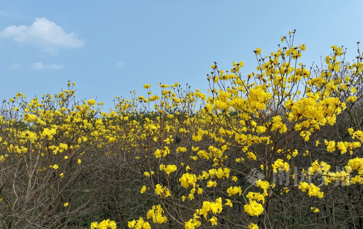 黄花风铃木:盛花期估计还要一周时间,在柳北区保利大江郡江边、北部生态新区湿地公园、东环大道北等,都可以欣赏到黄花风铃木的美丽的身影。