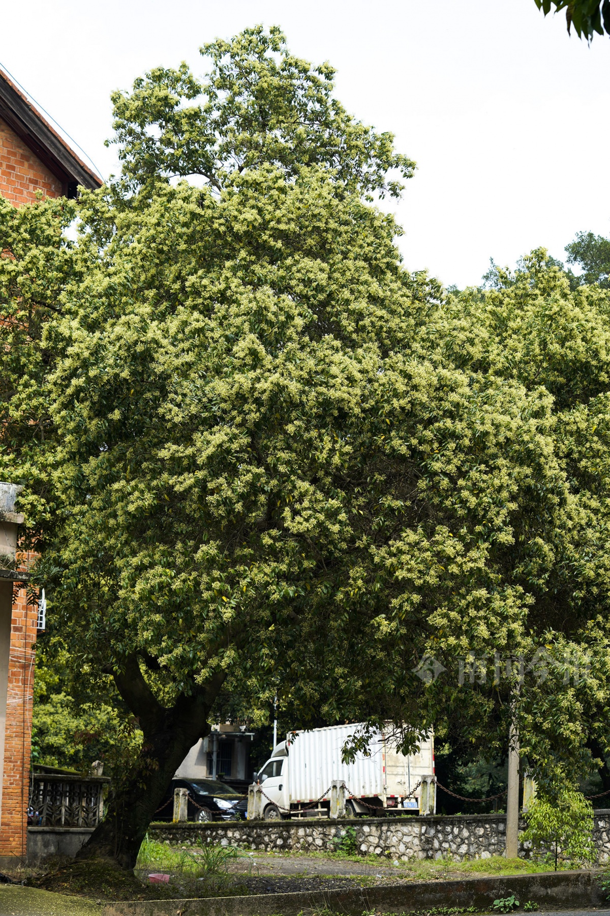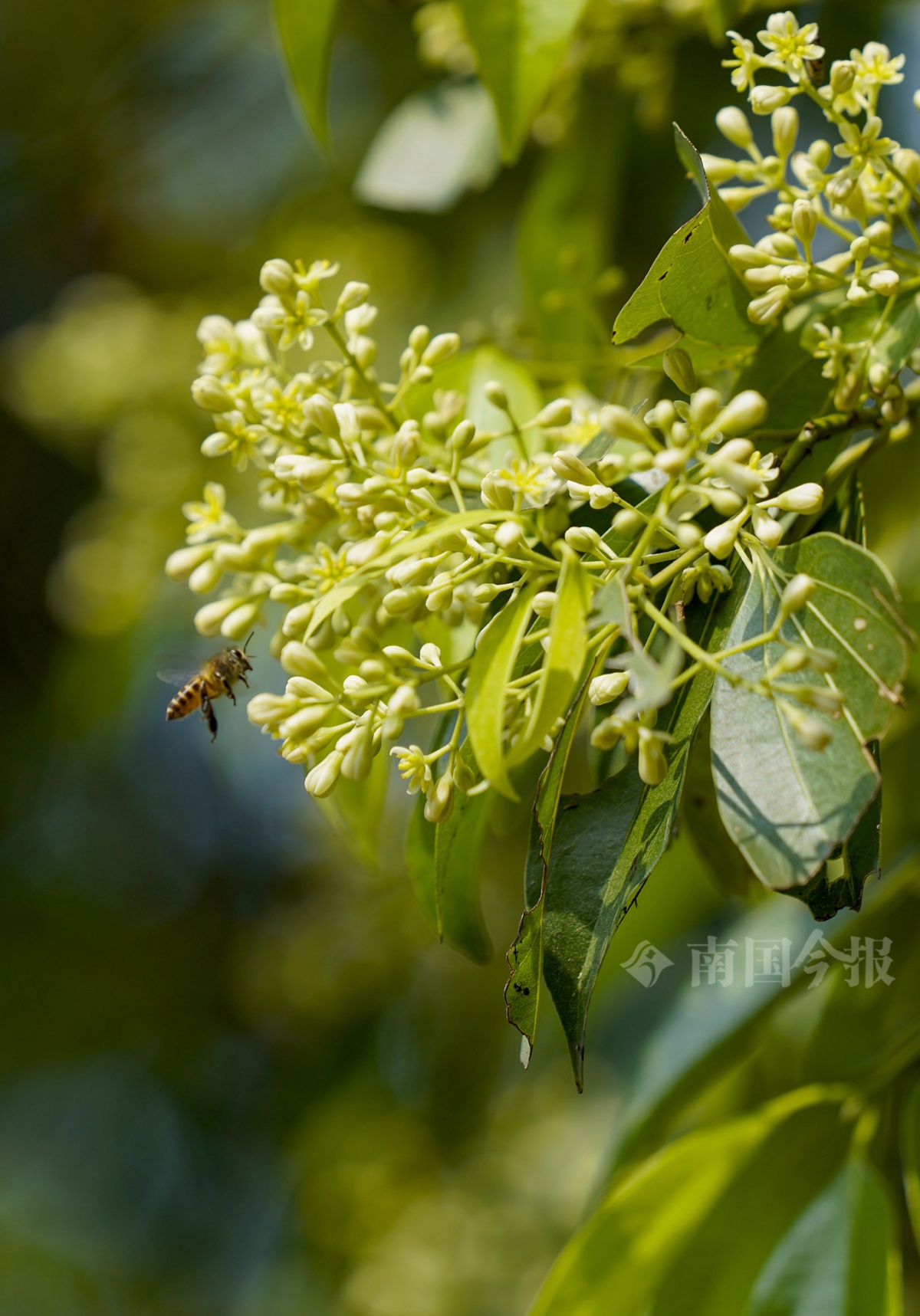 柳江造纸厂内的天竺桂满树都是花,吸引不少蜜蜂来采蜜。