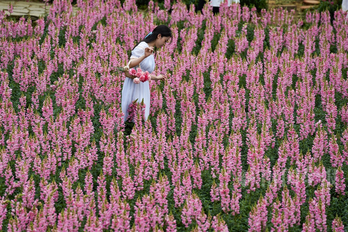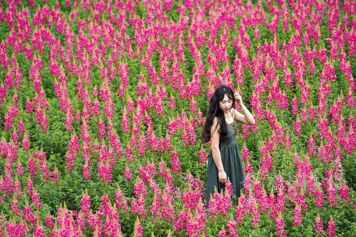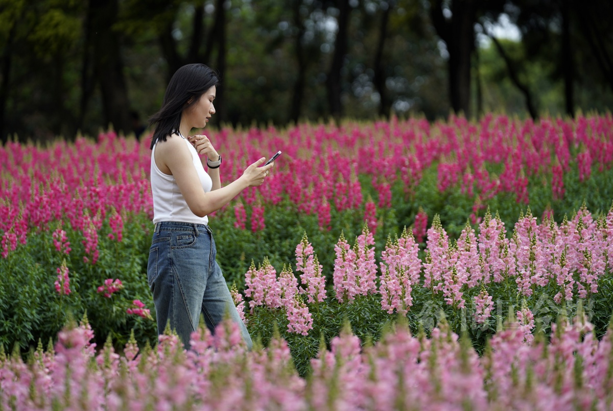 园博园内,游客在金鱼草花丛中拍照留念。