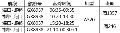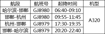 班期:每周二、四、六,具体情况以实际查询为准。换季后邯郸—杭州航线将是每日一班。