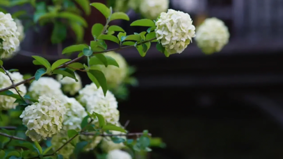 每年四月的何园,盛开的木绣球花是绝对是“顶流”。园内的玉秀楼有一棵百年树龄的木绣球,花开时团团簇簇,缀满枝头,花色由最开始的绿慢慢过渡成白。
