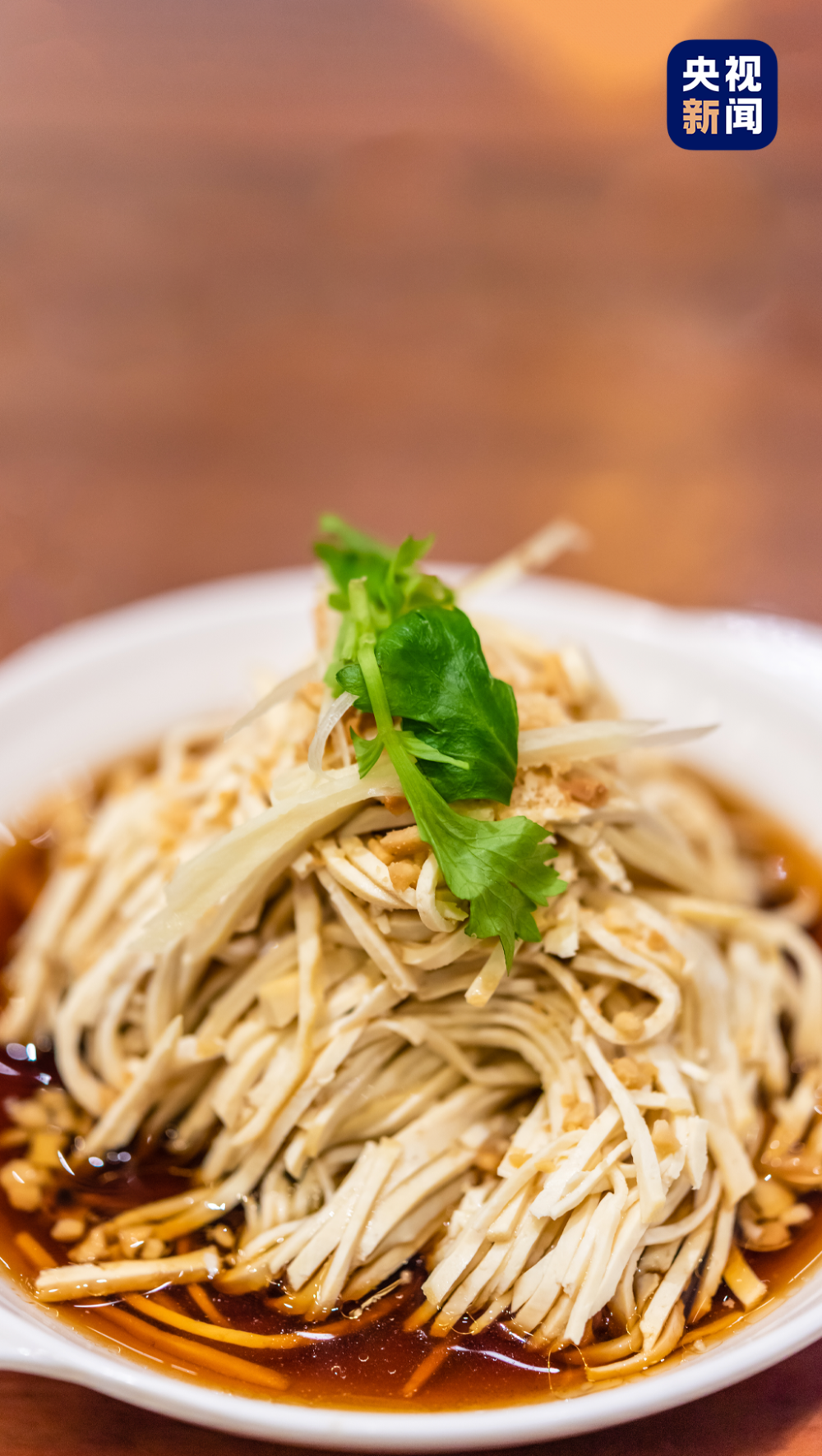 佐茶的首选是烫干丝。白嫩的豆干先切片,再细细切成丝,焯热水,淋上酱汁,功夫满满。另一种吃法则是大煮干丝,运用清鸡汤、各种鲜味配菜烹煮,每一根干丝都鲜味十足。