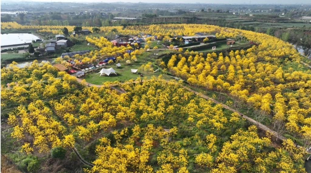 这段时间,金堂县赵家镇的3万余株黄花风铃木迎来了盛花期,将春日的仪式感拉满。在赵家镇莲墩社区6组金色春谷内(金堂县赵家镇莲墩黄花风铃木种植场),400多亩黄花风铃木犹如摇曳的风铃,在清溪河两岸怒放。