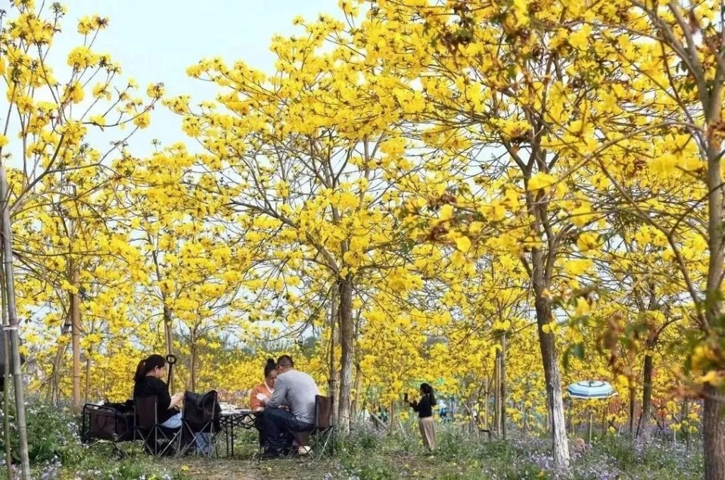 据了解,黄花风铃木花期较短,当前正是它绽放的时候,这个周末不妨赶紧约上亲朋好友一起打卡这片“限定款”春色。