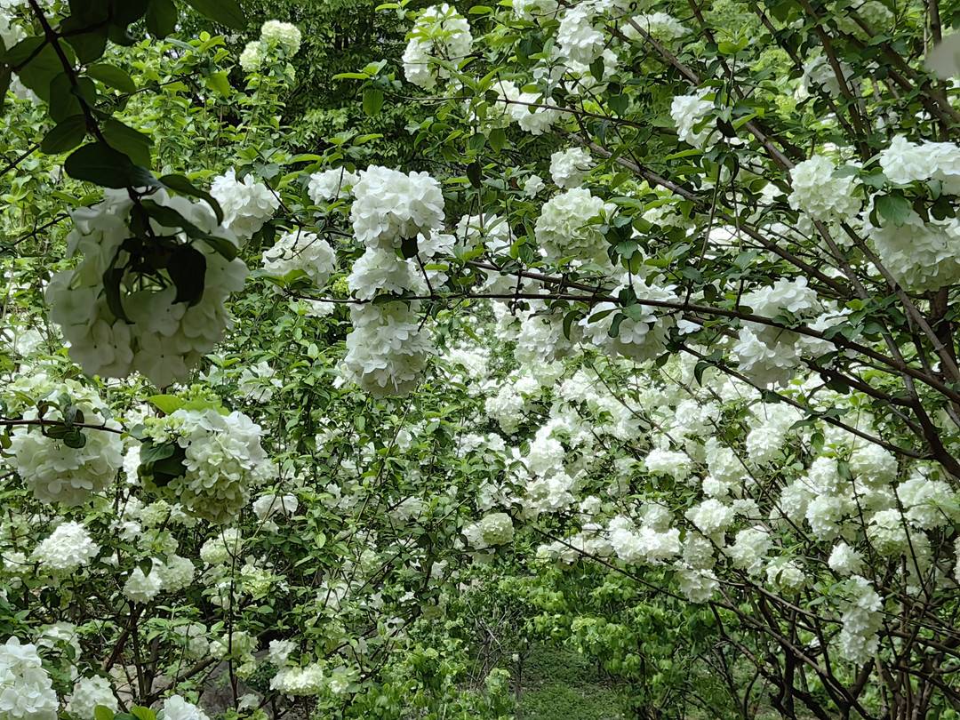 荚蒾别称为木绣球、八仙花、紫阳花,为忍冬科、荚蒾属落叶或半常绿灌木,花期多在每年的4月至6月。清明时节,植物园内的2000多株荚蒾正在开放,营造出一幅“花开不亚千团雪”“满树玲珑雪未干”的景观。据该工作人员介绍,从1988年开始,成都市植物园就致力于荚蒾属植物的引种保育,开展了荚蒾资源调查工作,通过与国内外合作,目前荚蒾属植物种类增加到近70种。在多年引种、繁育的基础上,为更好展示、推广荚蒾属植物,植物园于2018年建立了荚蒾属植物专类园——荚蒾园,占地15亩,展示的荚蒾属植物有60余种、2000余株,成为我国首个保存荚蒾属植物资源专类园。因此,绣球荚蒾成为了植物园的明星花。每年春夏时节,前来观赏的游客络绎不绝。