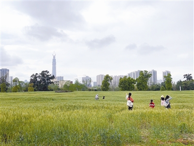 环城生态区绿道旁的大片麦田吸引众多游客