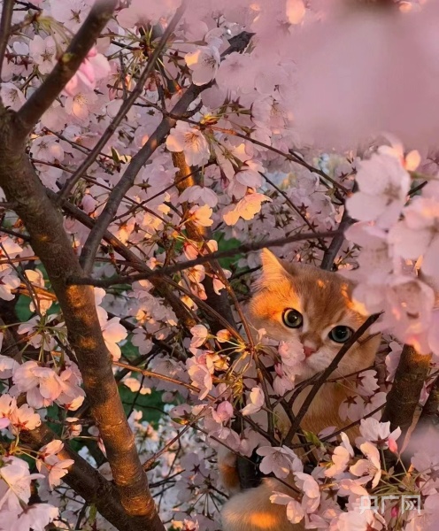 可爱的小猫与樱花相约一场浪漫的邂逅(央广网记者 栾小琳 摄)