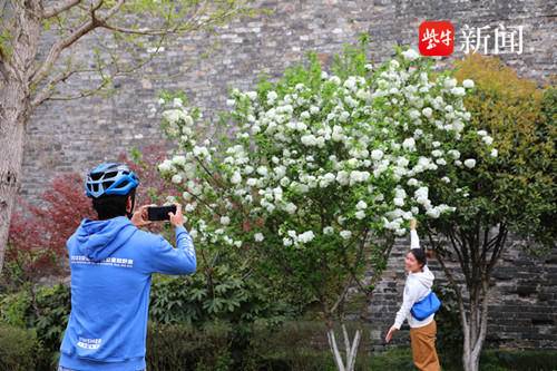 扬子晚报网4月7日讯(通讯员 徐福庚 记者 董婉愉)古人诗云“正是红稀绿暗时,花如圆玉莹无疵。何人团雪高抛去,冻在枝头春不知。”这首古诗里描写的花,便是木绣球花。记者今天在南京玄武区富贵山明城墙下看到,绣球花正竞相绽放,花团锦簇,吸引不少市民游人前来赏花拍照享春意。