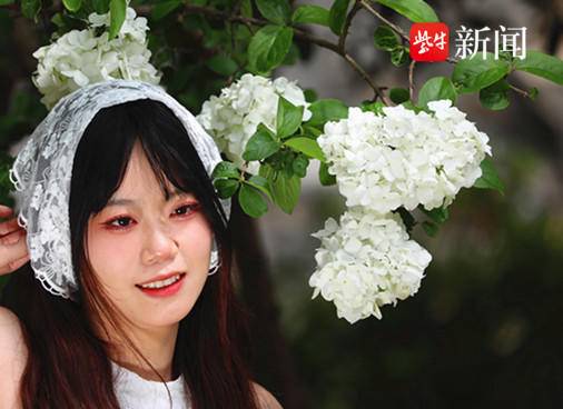与绣球花合影