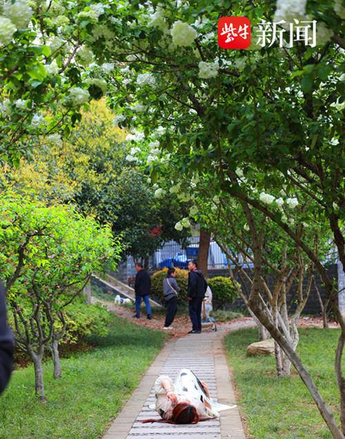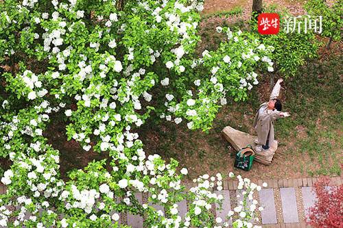 据了解,绣球花为“木本绣球”,属于忍冬科荚蒾属植物,花期集中在4月和5月。木本绣球树姿舒展,开花时白花满树,犹如积雪压枝,十分美观,被广泛种植在城市公园,风景园林景区等地。