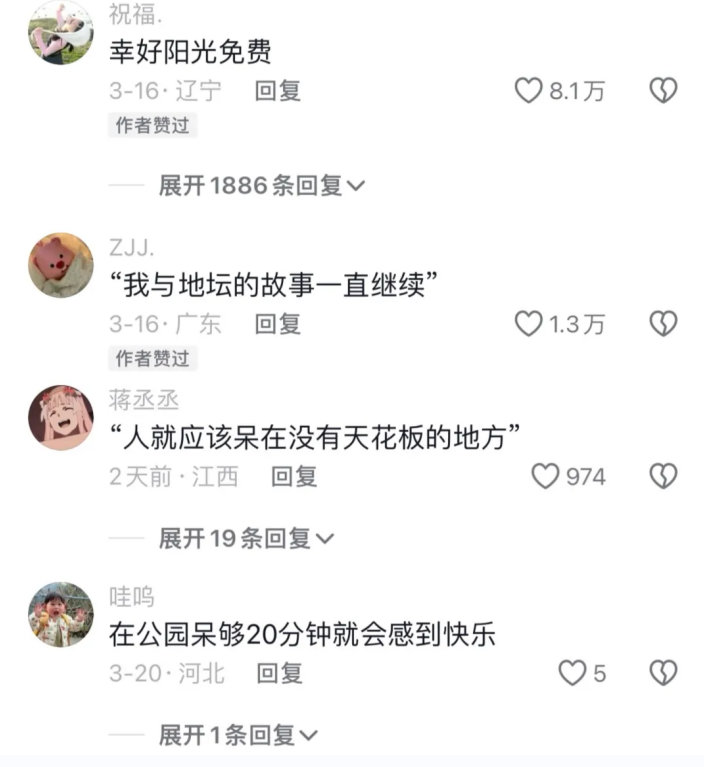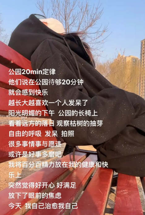 对于打工人而言,上班面对快节奏的工作压力,下班又要面对社交孤独,物理和精神双重层面都与自然割裂开来。颈椎病、腰肌劳损等疾病低龄化,年轻人甚至不敢面对自己的体检报告。除去购置绿植、囤货保健品,打工人也开始寻求精神疗愈。公园作为城市里“圈养”的自然,成为了人们的过渡带。它是社会共享的免费能量场,只需步入其间,放空自我,即可释放压力。网友经过实践后表示“亲测有效”,这背后也反映出人们对美好生活的更高追求。