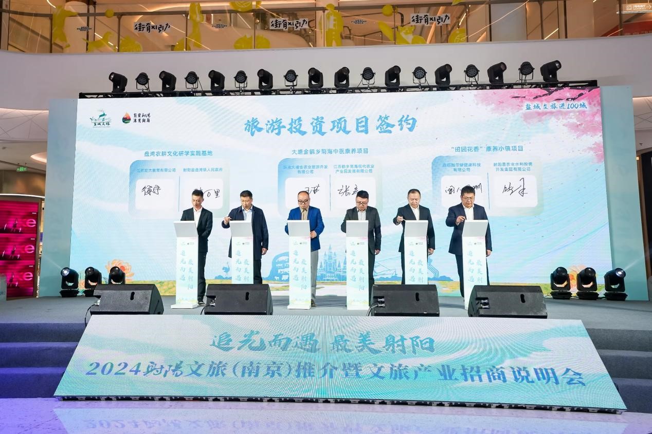 推介会上,射阳县文广旅局就射阳文旅资源和招商说明进行了推介,还有来自南京的旅游达人分享自己在射阳度过的美好时光,推荐射阳文旅。活动现场,10个重点文旅项目集中签约,涵盖旅游项目投资类、业态运营类、旅行商合作类等,为射阳文旅产业高质量发展增添新动能。