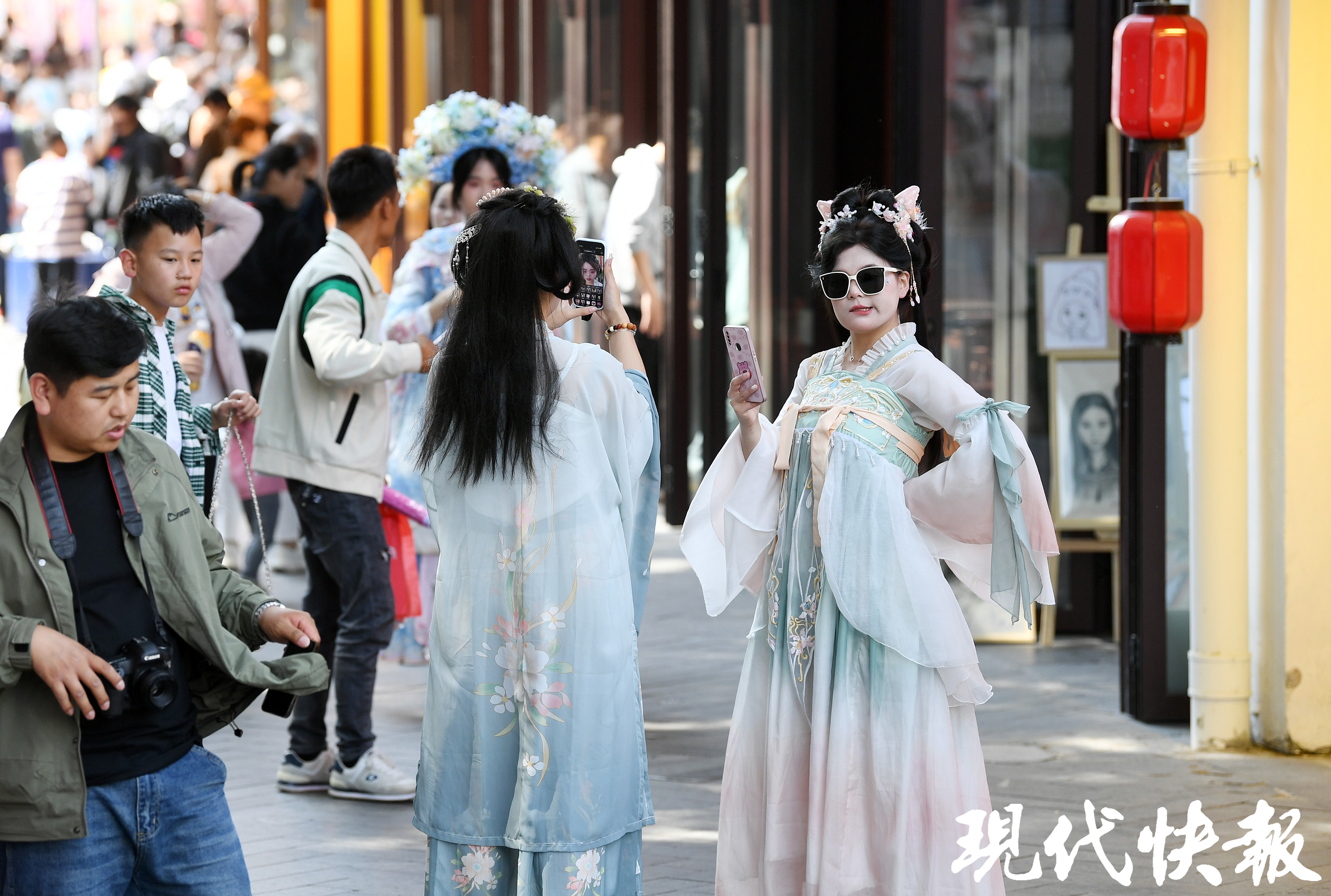 夫子庙承载着厚重的历史文化底蕴,古韵悠长。景区内,能看到不少穿着汉服、头戴簪花的少女。“夫子庙和古风服饰很搭,穿着汉服漫步其中,很有感觉,但是想租汉服一定要提前约。”“00后”陈思雨来自浙江衢州,她和朋友提前两周就预约好了租衣服、做妆造的汉服馆。她感叹,假期出游的人实在太多,5月1日晚上本想夜游夫子庙,但奈何人太多。“都说感觉有1亿人在夫子庙,我觉得可能比1亿还多。”