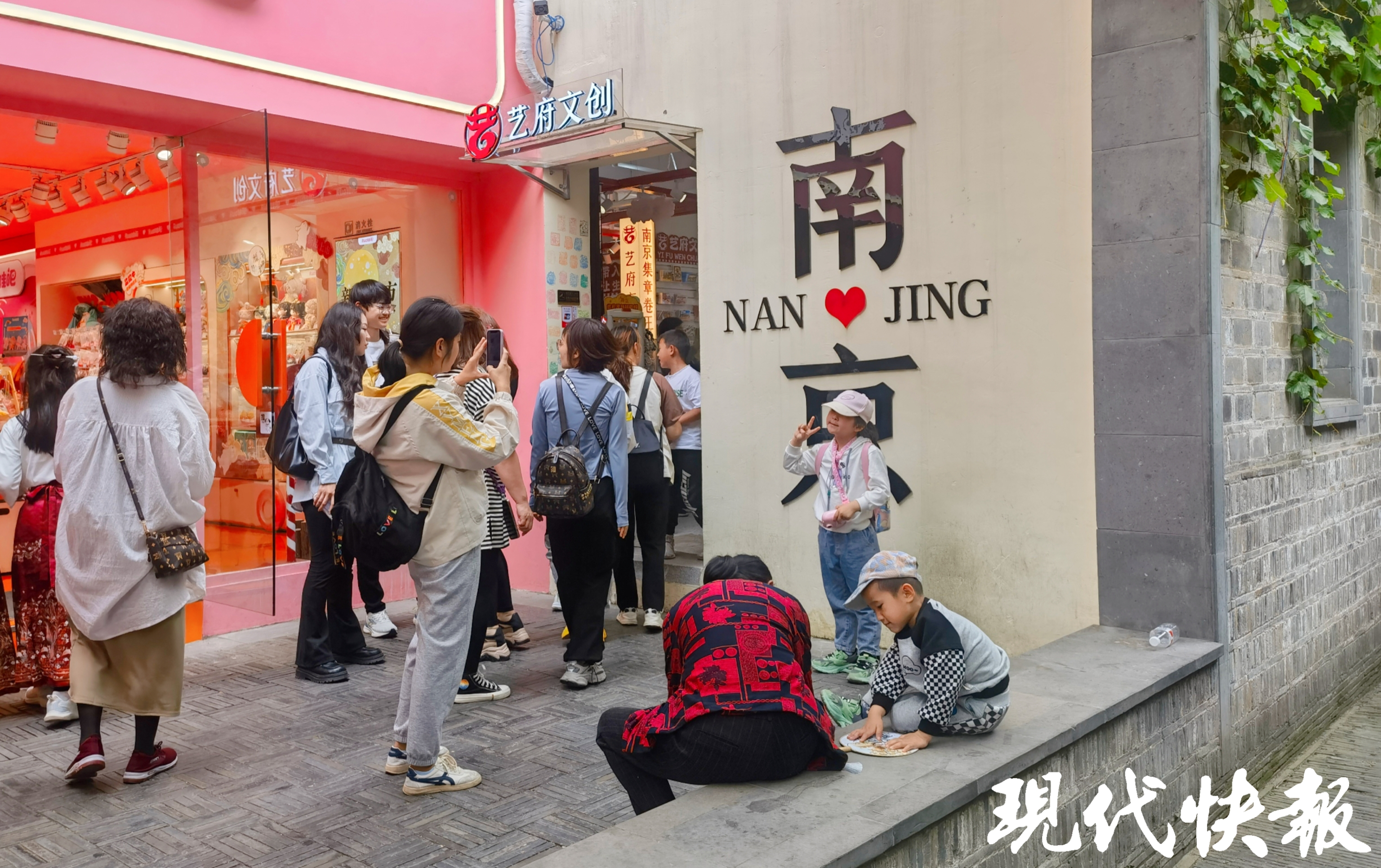 在老门东景区深处,有“南京”二字的白墙,以及白墙对面拼出“南京”字样的砖墙,是热门拍照打卡点。路过的游客都会停下来,驻足拍照。