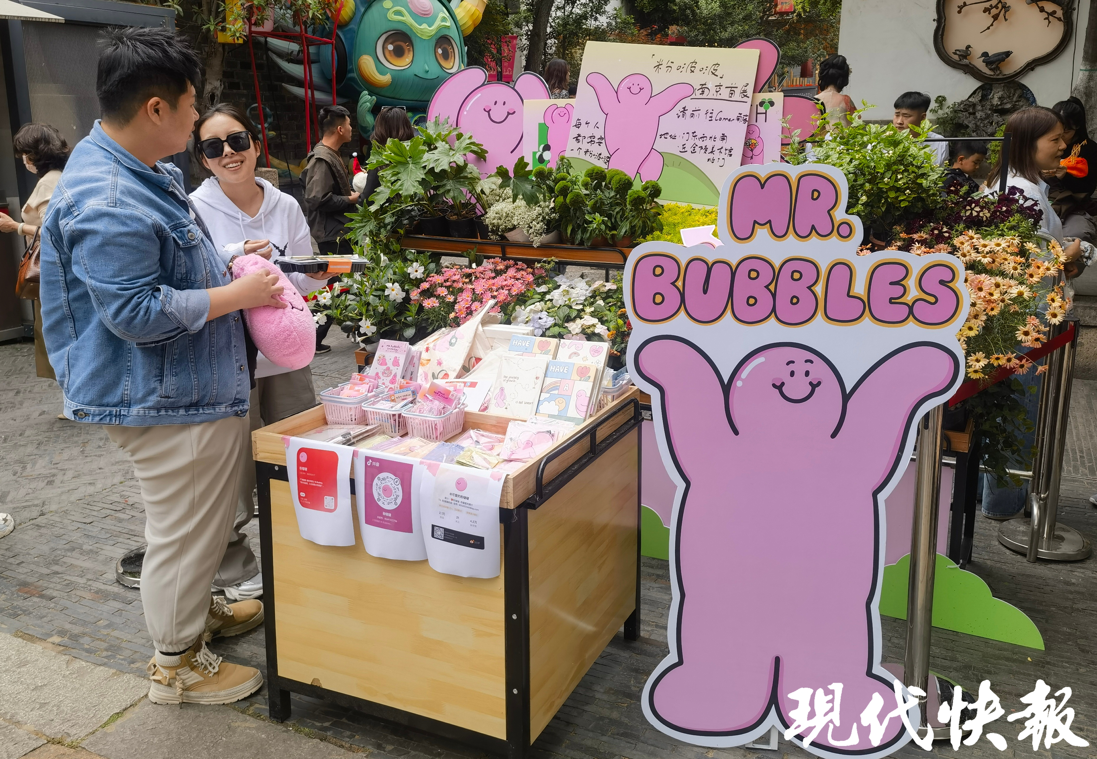“五一”假期期间,“城南新座-CORNER”推出了“ZHI人超级鲜花市场”活动。游客打卡相应“粉啵啵”主题装置,上传至社交媒体平台,并带话题“我在corner角落与粉啵啵一起走花路”,即可获得“粉啵啵”限定周边一份,至粉啵啵咖酒食餐车购买冰淇淋还可额外获赠编织袋一份。现场,“粉啵啵”装置吸引不少年轻人打卡。