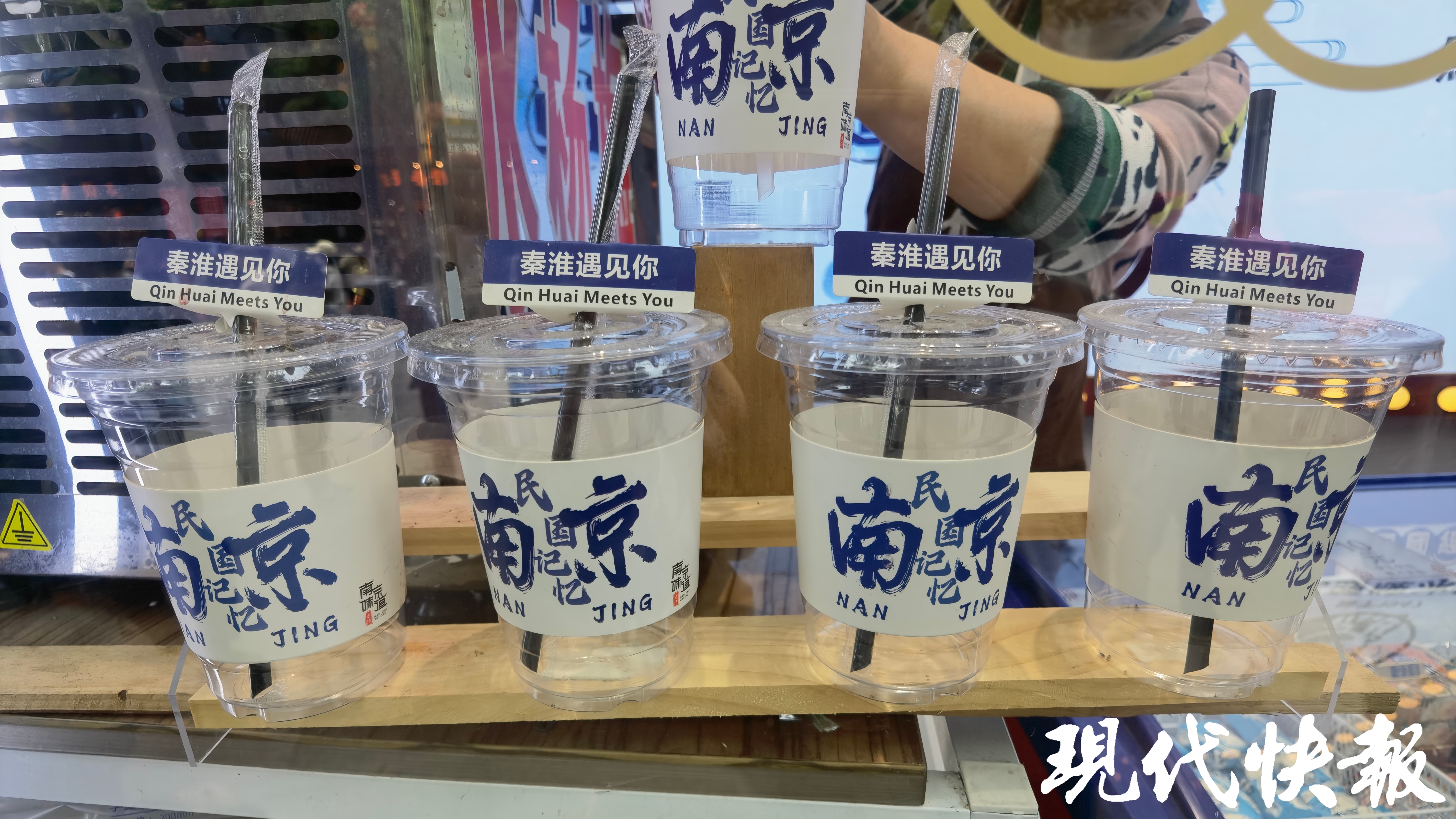 来夫子庙游玩的外地游客,总想留下一些与“南京元素”有关的打卡照。秦淮·戏院里门前的墙面装饰融合了南京和夫子庙元素,还配有祥云、牌坊图案,吸引了众多游客驻足拍照;小店里售卖的文创雪糕造型各异,包含了“南京”字样、梅花、状元等元素,深受外地顾客欢迎;还有不少年轻游客排队购买杯套上印有“南京”二字,并配有“秦淮遇见你”标签的杨梅冰饮。