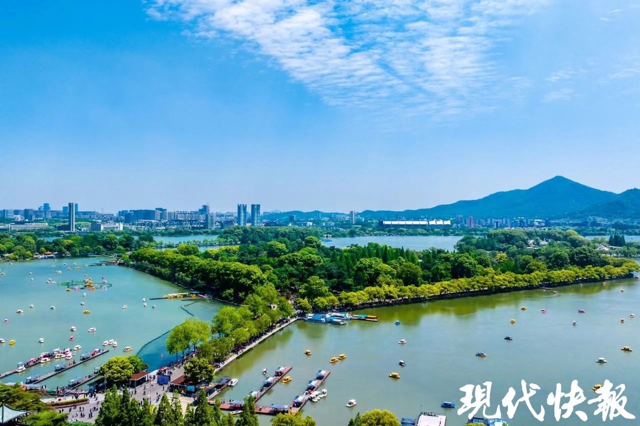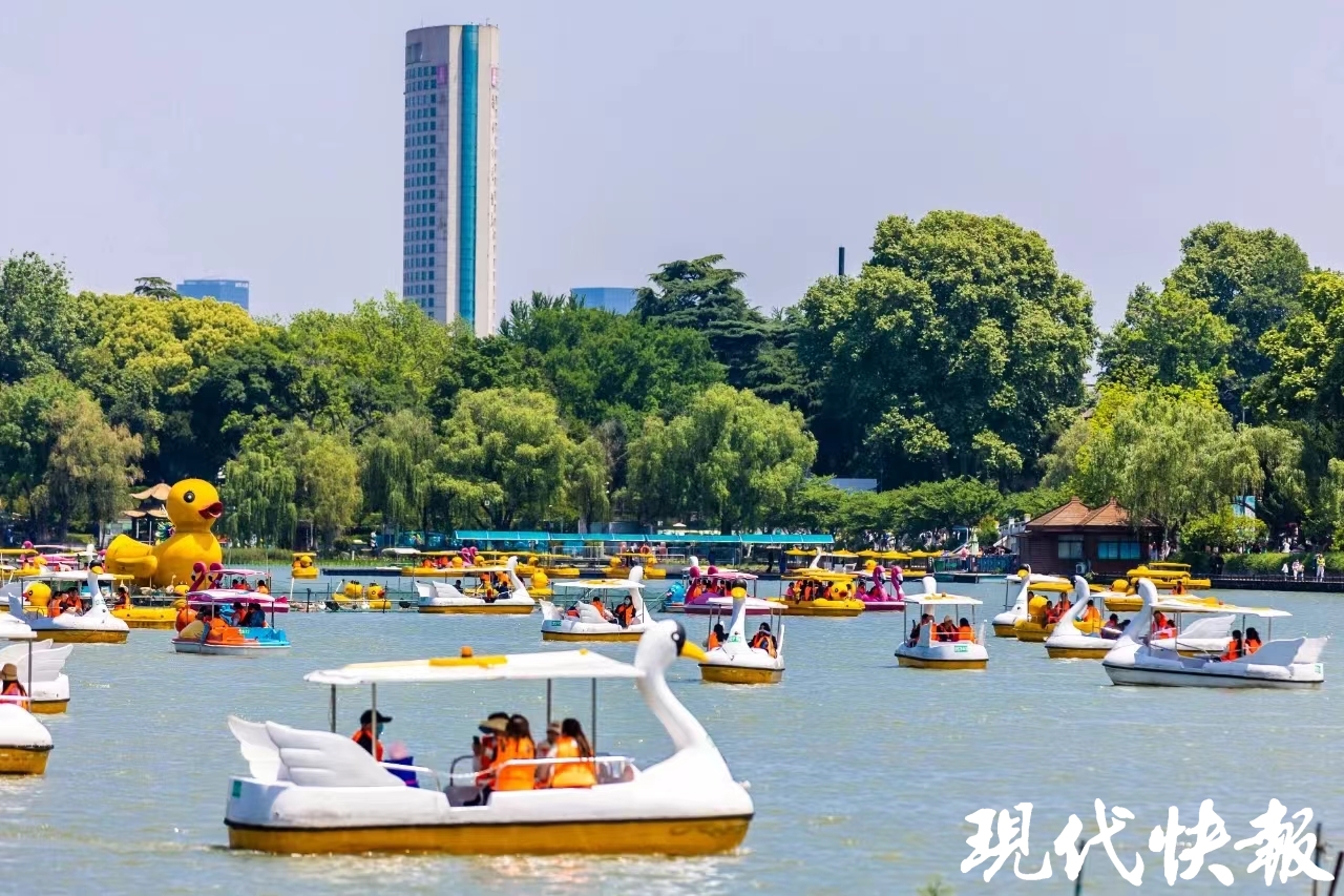 记者还看到,岸上游人众多,有不少游客选择下湖游船,鸭子船、火烈鸟船、天鹅船穿梭往来,自成风景。