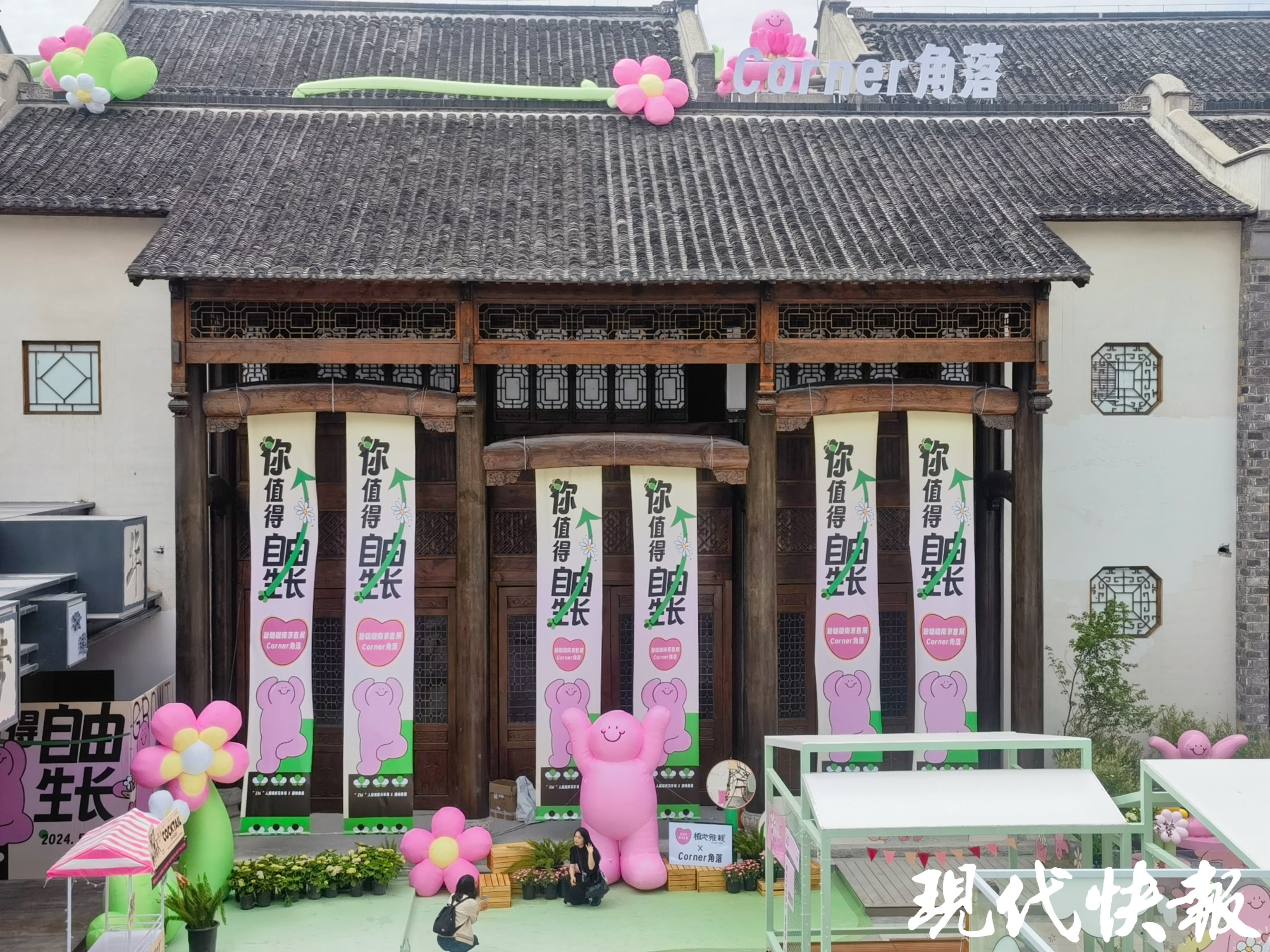“城南新座-CORNER”位于老门东西北角,是老门东新开放的一个区域,也是新添的潮流打卡地。记者了解到,这个新区域总建筑面积约6000平方米,整体以“回”字状布局。作为一个全新打造的消费空间,“城南新座-CORNER”以传统的院落式布局手法,有机利用下沉广场,结合时下热门业态场景,推出新视觉、新体验,有效衔接日消费与夜生活。空间内不仅引入了“裸眼超视觉体验馆——飞越南京”,还汇集了知名奶茶、餐饮、咖啡品牌。