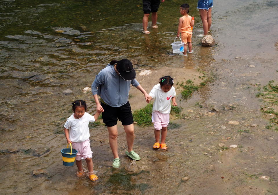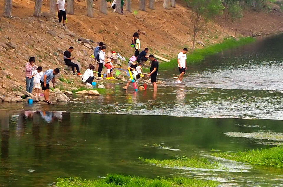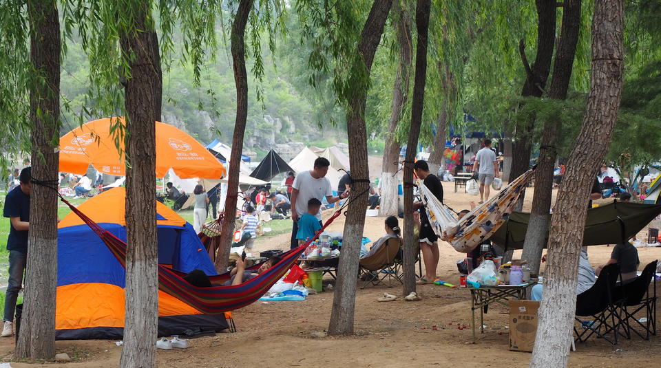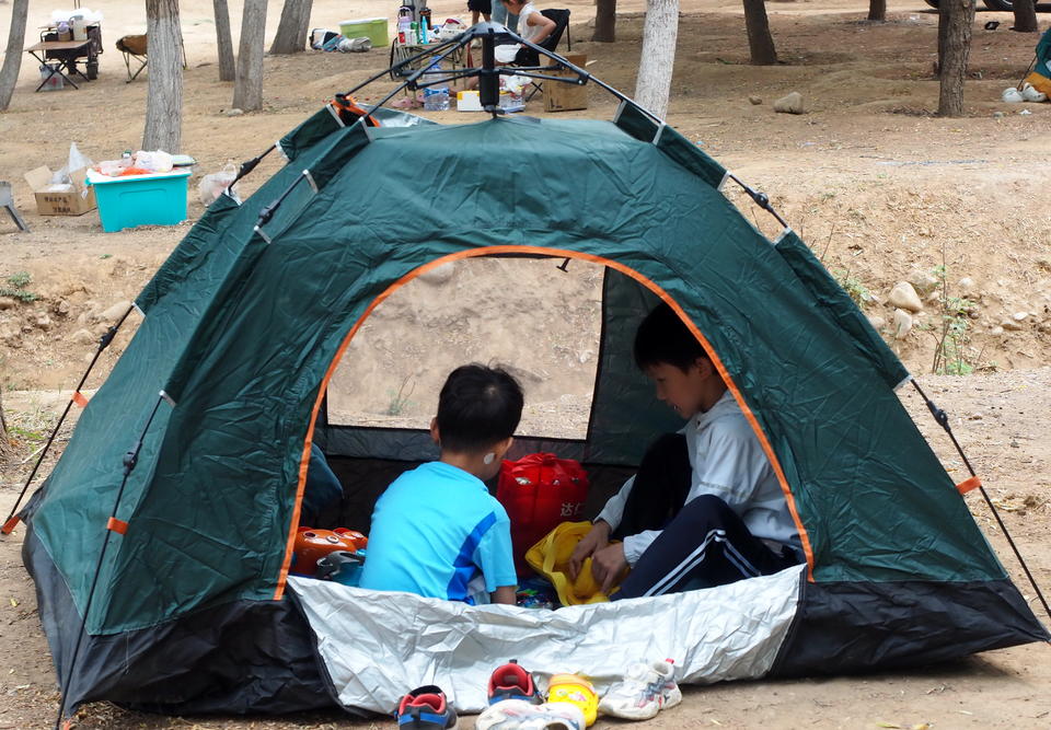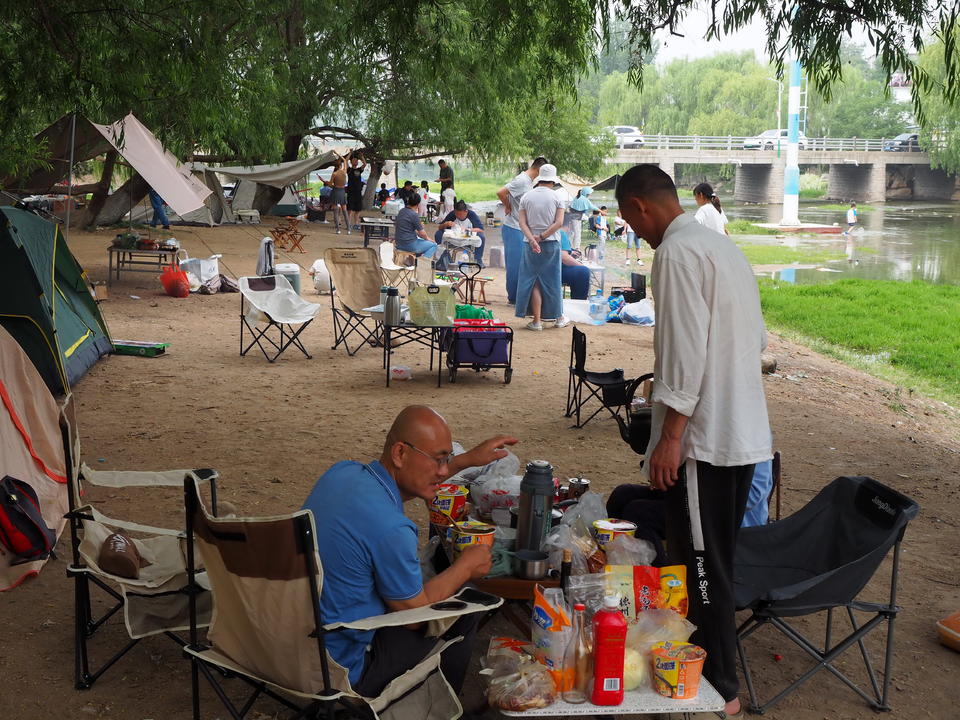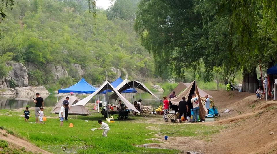 据了解,为了占据河边的黄金地带,不少家庭提前一天就派人来露营占地了。由于近期卧虎山水库放水,这里清澈的流水非常适合孩子们玩水,因此近郊游相当火爆。