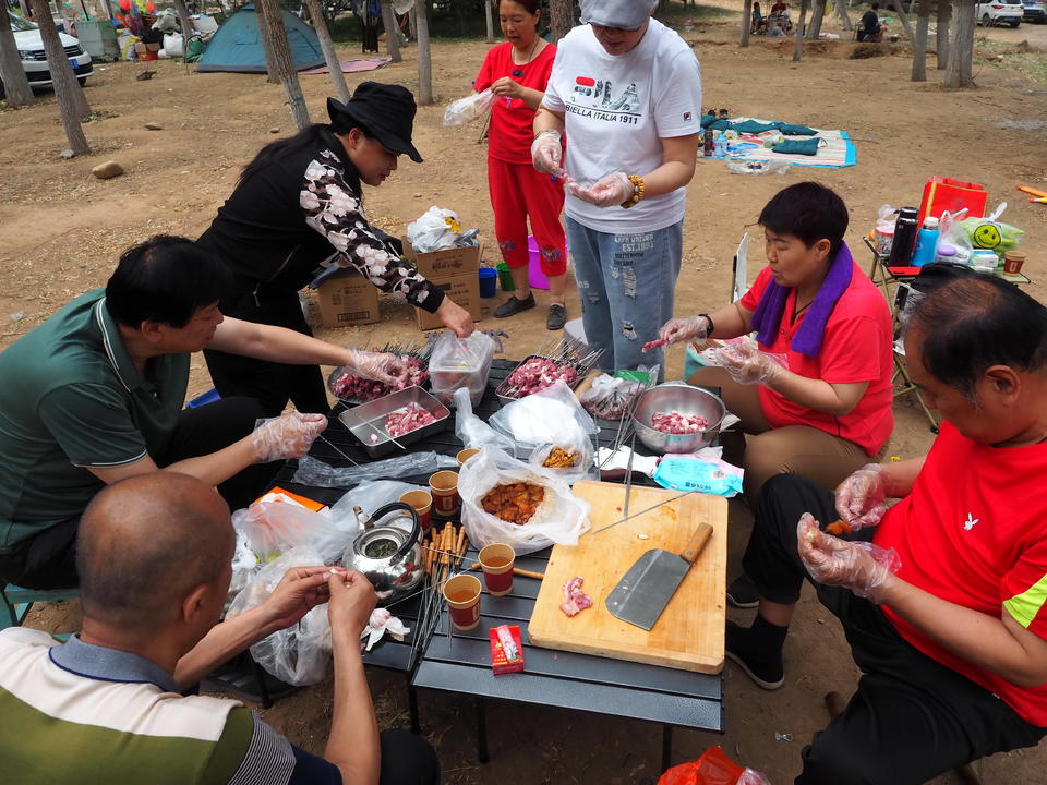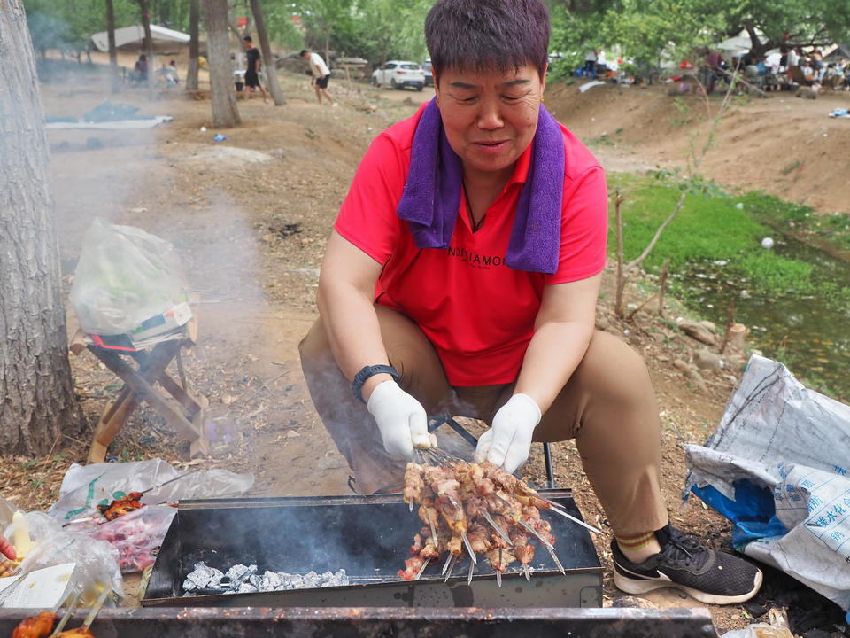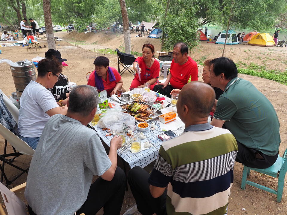 5月末尾的周末,济南凉风习习,南郊玉符河流水潺潺,景色美丽动人。大批市民出来郊游,大家扎起帐篷、摆好烧烤架,品尝当地新鲜的水果蔬菜,一家人尽享天伦之乐。