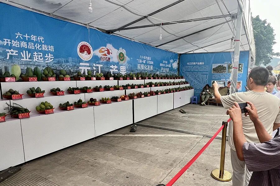 元江芒果品种展示。 在金芒果·品种展示秀上,来自元江各地的多品种优质芒果纷纷亮相,吸引了众多游客驻足观赏。据资料统计,元江种植过一百四十多种芒果品种,其中部分特色品种果肉香甜、色泽光亮,在全国农业博览会上屡获嘉奖。 金芒果·商贸一条街热闹非凡。 金芒果·商贸一条街则是今年芒果节的另一大亮点。在这里,游客不仅可以品尝到牛羊肉汤锅、白族米干、傣族干巴等特色小吃,还能购买咪哩茶叶、那诺哈腊肉、羊街梯田红米等各乡镇的特色农产品,现场人头攒动,热闹非凡。 长街宴祈福仪式。 逛到饭点,一场独具民族特色的长街宴热闹开席。上百米的长街上,汇集哈尼族、彝族、傣族、白族等各民族风味特色的美食让人垂涎欲滴。除了美食之外,长街宴还融入了丰富的文化元素,饭前的祈福仪式为宾客送上真挚祝福,宴席中央还举行民歌展演,以歌会友,展现元江民族文化风采。 迎宾晚会。 晚上八点,芒果节迎宾晚会隆重举行,晚会分为《元江花果城》《避寒养生地》《中国萨王纳》三个篇章,精心编排的节目精美绝伦、流光溢彩,向四方来宾尽情展示元江多姿多彩的民族民情。 近年来,随着元江芒果种植规模不断扩大,品种持续优化,元江县确立了以芒果为主的热带水果产业为“一县一业”主导产业,通过“芒果现代农业产业园”“山地芒果标准化示范基地”等一批重点项目建设,芒果产业从种植、加工到销售都得到了很好的发展。“元江芒果”被注册为地理标志证明商标,全县有3户省级龙头企业、7户市级龙头企业,芒果种植户达13500余户。2023年,全县芒果种植面积达24万亩、产量24万吨,农业产值达13亿元,成为全国芒果优势产区之一,是云南省芒果种植加工第二大县。