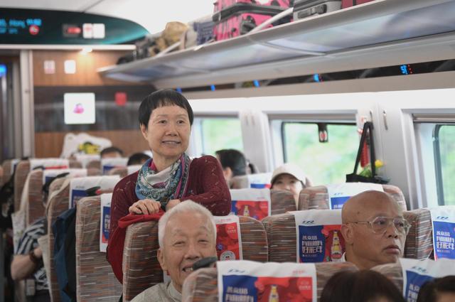 记者在列车上发现,车厢里座位已基本坐满,耳边时不时能听到粤语,说着“你看看这山,几壮观!”“我上一次来湖南,是5年前了!”“请问餐车在哪里?”“能麻烦你帮我们拍照合影吗?”负责承运这条线路的是复兴号列车,相较和谐号列车,复兴号列车更为宽敞明亮,车内的设备更加智能化,车厢里的语音是普通话和粤语播报,电子显示屏上,也是英文和中文双语显示。