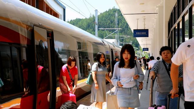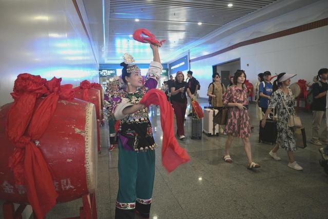 14:07分,列车到达凤凰古城站,记者在出站通道处就感受到了当地人们的热情,苗鼓敲起来,拦门酒喝起来,不少旅客在尝试了一口酒之后,甚至“辣出表情包”。还有很多旅客对五颜六色的苗族服饰、亮闪闪的银饰很感兴趣,纷纷和身着传统苗服的阿姐们合影留念。凤凰县文旅广电局副局长瞿菀吟介绍,为了迎接首发列车,他们也准备了文旅大礼包,如沈从文书籍、赠送的景区门票等,另外乘坐首发列车过来的旅客当日还可以免费乘坐凤凰磁浮,从凤凰古城站至凤凰揽胜站观光游览。