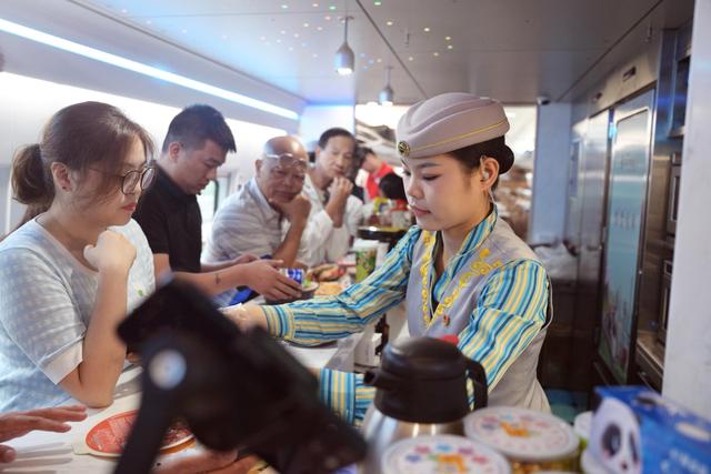 临近中午用餐时间,记者在5号车厢的餐车处见到了很多准备购买餐食的旅客,“请问还有什么菜呀?”“还有盐焗鸡饭和腊味双拼煲仔饭。”记者从负责餐饮的工作人员处了解到,考虑到这条线路上的旅客需求特点,列车上准备了梅菜扣肉饭、台式卤肉饭、红烧牛肉套餐等粤菜,同时也准备了宫保鸡丁、农家一碗香、东坡肉、酸菜鱼等湘菜,还有一些虾肉馄饨、肉酱意大利面等不同风味的餐食,可以满足旅客不同的用餐需求。“卖得最好的是卤肉饭和农家一碗香。”才刚过中午12点半,这两样畅销餐食就已经卖完了。负责餐饮的工作人员说,因为车上有旅行团,所以备餐工作量较大。