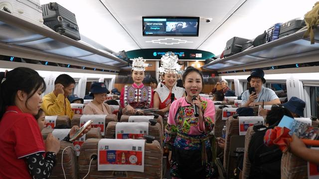 “高山有好水,瀑飞壮豪情,高山有好水,甘泉酿痴情”车厢里,一首现场演唱的《高山有好水》音乐响起,瞬间把大家的热情点燃。原来,是湘西州的文旅宣传小分队正在为车上的旅客进行表演,并且还有旅客问答环节和赠送伴手礼。颇具湘西民俗特色的扎染布艺、艾草养生锤、遮阳帽、布包等等伴手礼送到远道而来的旅客手中,他们都非常喜欢,纷纷表示“还没到达目的地,就已经收到了这么具有代表性的礼物,非常有意义,有纪念价值,非常钟意!”