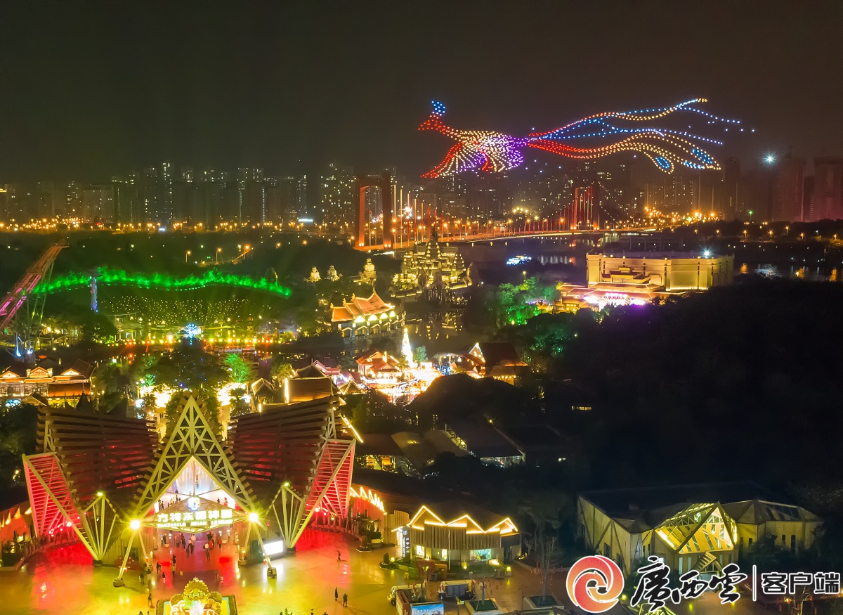 2月14日,在南宁方特东盟神画景区,2000架无人机点亮南宁夜空。在夜空中,无人机方队变身超级巨龙、神凤飞天以及壮美广西的美丽画卷,为新春佳节献上美好的祝福,营造出喜庆祥和、国泰民安的浓浓气氛。通讯员朱小明摄