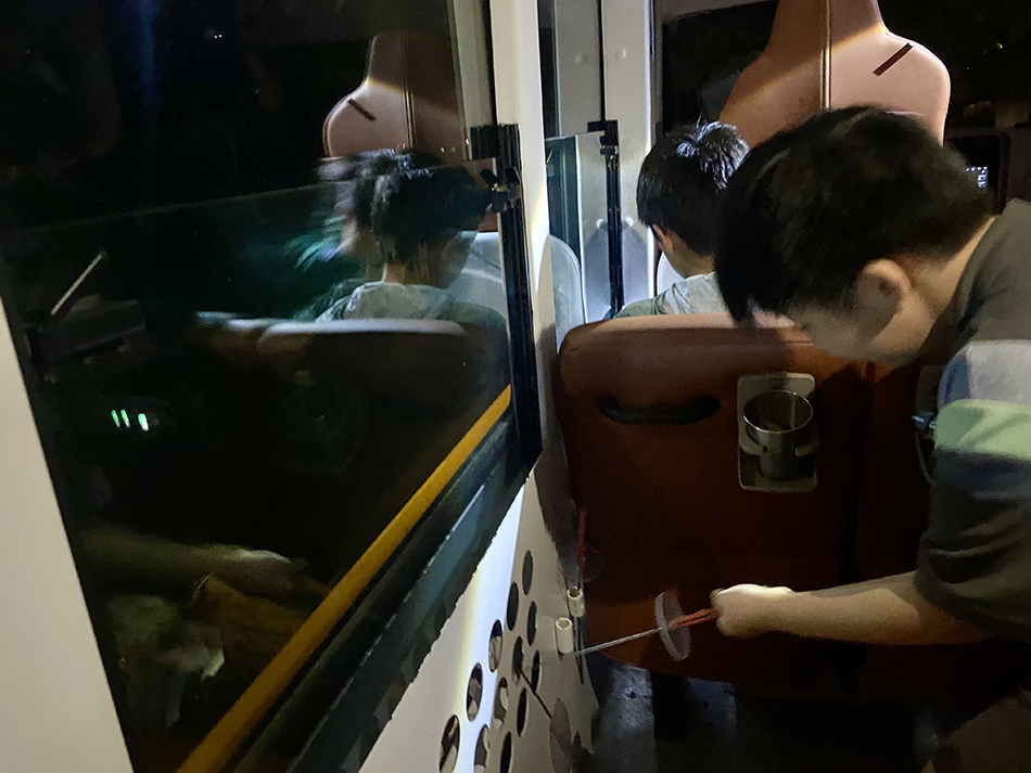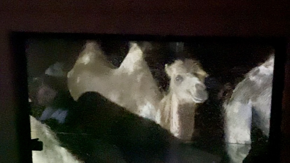 一只小鹿不经意闯入视线,成群的斑马在路边踱步,正在换毛季的骆驼和车窗一般高,嘴还在忙着咀嚼。车继续往前,从食草区进入猛兽区,一只猎豹正坐在吉普车车头,一转身看见满车人,它也有点懵。讲解员提示可以把备好的苹果串一串,伸出车窗下的孔洞,黑熊扑上来一路横扫,觉得没吃够还追车跑了几步;马来熊离得有点远,独自在树屋里捣鼓一个球体,大概是想找点吃的……人们瞪大眼睛在黑暗中搜寻动物身影,一有发现便是满车惊喜。