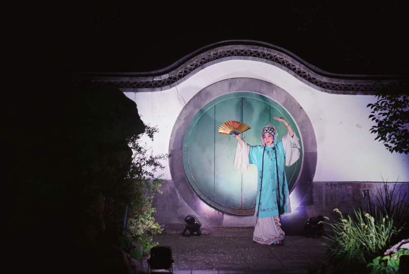 步入静心斋景区,古筝独奏《高山流水》在韵琴斋悠扬响起,瞬间将游客带入古典雅致的氛围中。在静谧的夜间园林中,演员以亭台楼阁为背景,演绎昆曲《牡丹亭》的经典片段,给游客带来更加强烈的“代入感”。