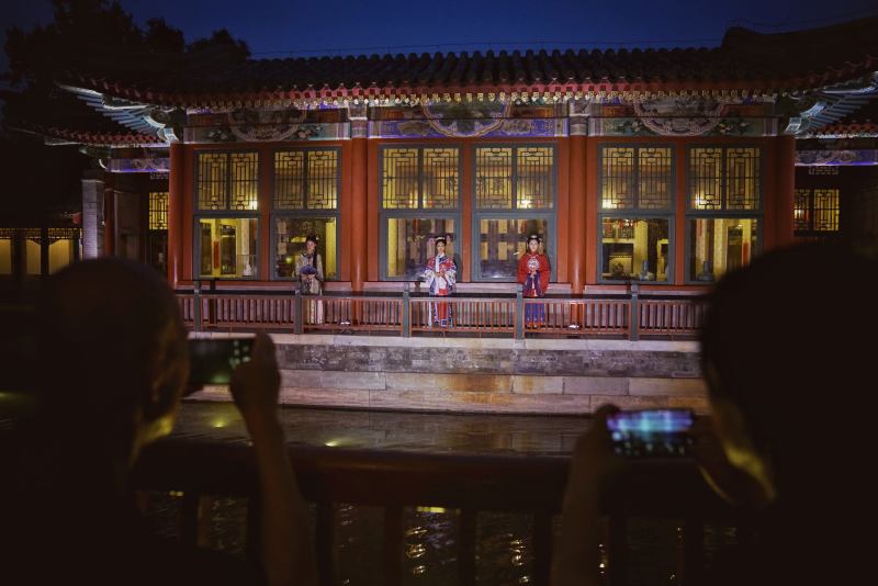 北海公园的特色晚间文化活动《印·静心》拉开帷幕,观众用手机拍摄演出。新京报记者薛珺摄