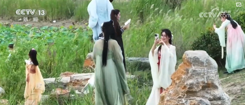 同时,商丘古城还保持着古代城市内城、城湖、城郭“三位一体”的布局。在古城的四周,有5800亩的护城湖面。这个时节来古城游玩的游客一般会选择傍晚来,先到湖边赏一赏正在盛放的荷花,再坐着画舫到湖中心,那里有1000多只白鹭聚集的鸟岛,游客可以穿着古装,在湖面拍照留影。穿国风服饰逛古城处处是风景