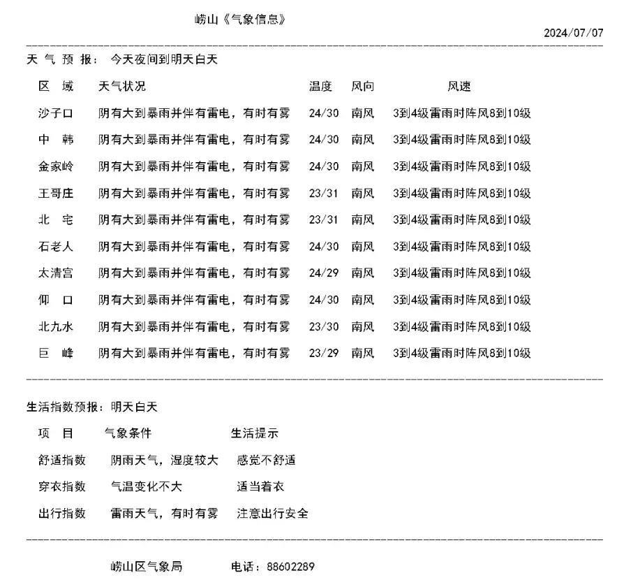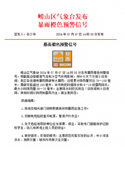青岛市气象台2024年7月7日13时30分发布暴雨橙色预警:受副高边缘暖湿气流和冷空气共同影响,预计7日下午到8日夜间,我市中南部地区有暴雨局部有大暴雨。崂山区全区有暴雨,局部大暴雨并伴有雷电。全区过程累计平均降雨量70~100毫米,局部超150毫米,伴有短时强降雨,最大小时降雨量50~70毫米。区防指已启动防汛Ⅲ级应急响应。