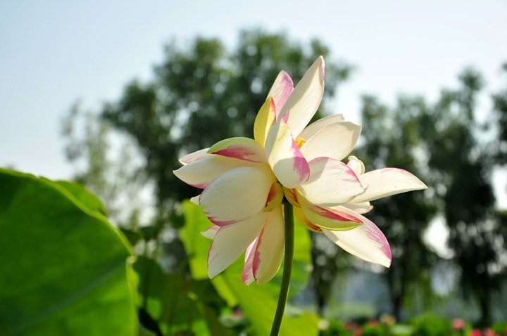 6月19日发现第三朵并蒂莲,品种为“单洒锦”,为单瓣洒锦类,白色的花瓣边缘有粉红色的嵌色,观赏性强,发现时是花苞状态,6月27日盛放。