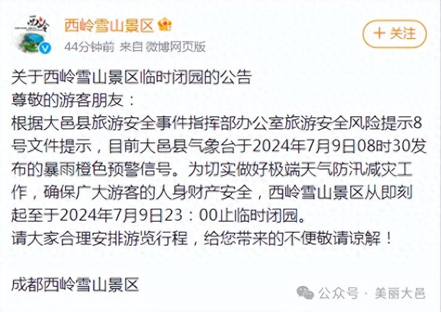 根据大邑县旅游安全事件指挥部办公室旅游安全风险提示8号文件提示,目前大邑县气象台于2024年7月9日08时30分发布的暴雨橙色预警信号,为切实做好极端天气防汛减灾工作,确保广大游客的人身财产安全,西岭雪山景区从即刻起至2024年7月9日23:00止临时闭园。