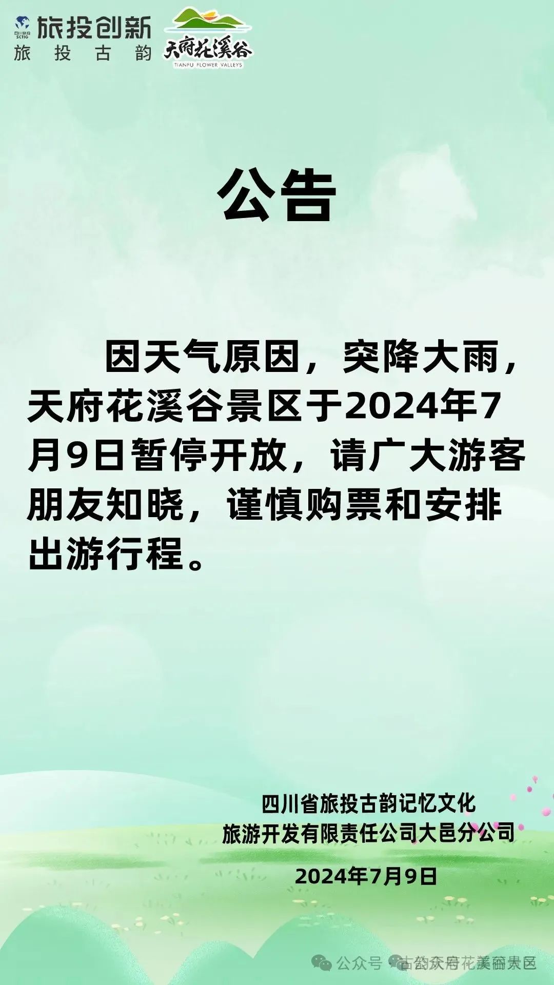因天气原因,突降大雨,天府花溪谷景区于2024年7月9日暂停开放,请广大游客朋友知晓,谨慎购票和安排出游行程。
