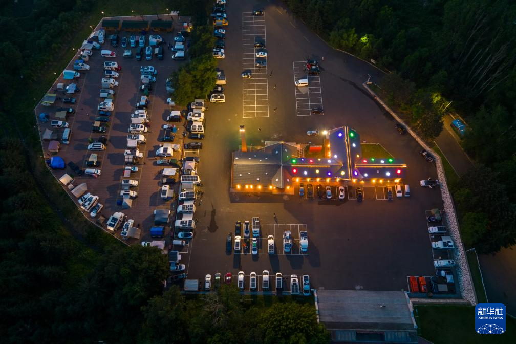 游客将车停靠在兴安国家森林公园房车营地(无人机照片,7月11日摄)。