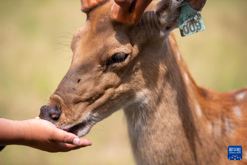 7月11日,在伊春市上甘岭溪水国家森林公园鹿溪牧场内,一名游客给鹿喂食。